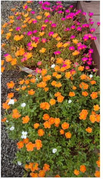 ポーチュラカの花言葉は 『いつも元気』花言葉のとおり、花がらを摘んだり、特に手をかけなくても夏の間、ず〜っと、綺麗に咲いてくれます。夏の初めに、4株植えたポーチュラカが、毎日こんなに咲いています。